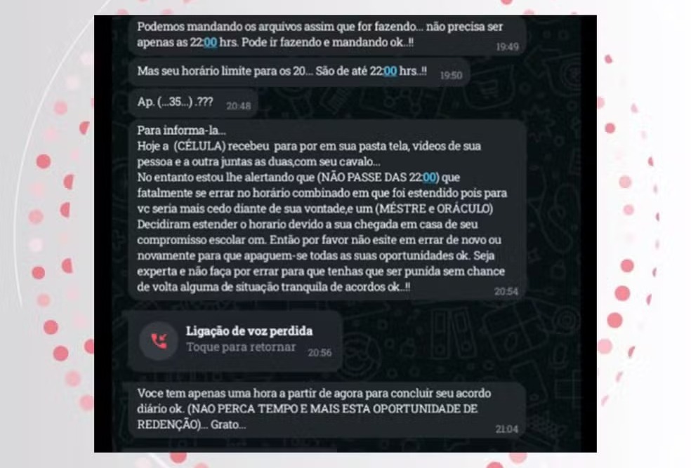 Os suspeitos faziam cobranças constantes, usando ameaças com tons de misticismo para obter as gravações até as 22h. Eles chegavam a citar um “acordo diário” e dizer que elas teriam poucas horas para concluir.
