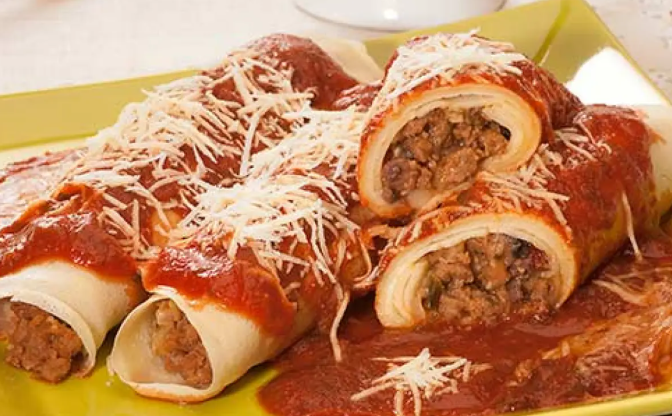 A massa de panqueca é feita batendo leite, farinha de trigo, ovos e sal. Em frigideira, prepare os discos e recheie com carne moída refogada no molho de tomate.