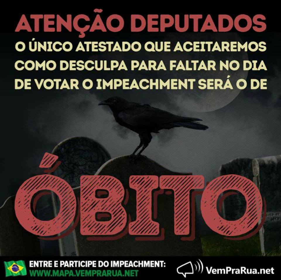 Para pressionar deputados, “Vem Pra Rua” diz que único atestado para não votar impeachment “é o de óbito”