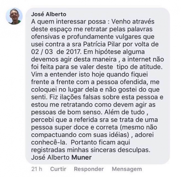 Para se ter ideia de quem é o agressor que agora se retrata, basta fazer uma pesquisa na internet e ver o teor de seus comentários. Ele é um defensor do MBL.