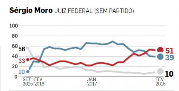 Moro está hoje com 51% de rejeição – um dos patamares mais altos desde o início da série, em setembro de 2015 – enquanto sua aprovação vem caindo: atualmente, é de 39%.