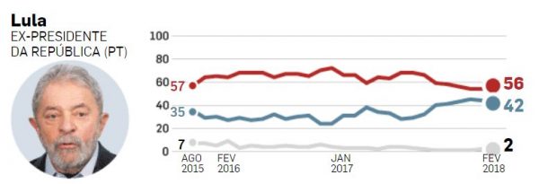 Lula, por sua vez, ainda é numericamente mais rejeitado que o juiz: hoje é desaprovado por 56%. Mas esse índice se mantém estável desde agosto de 2015, a despeito de todas as investidas da Lava Jato e de outras operações.