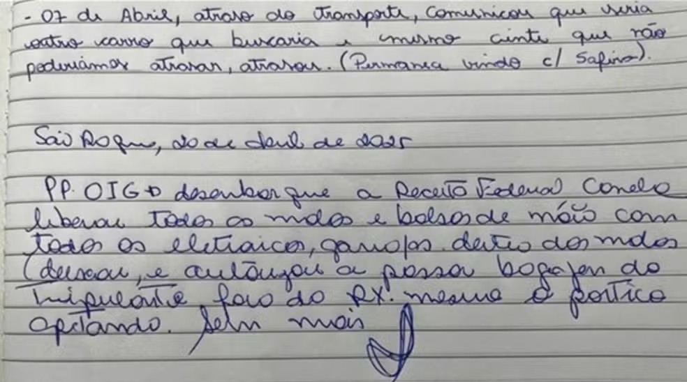 Um registro manuscrito no Aeroporto Catarina, em São Roque (SP), aponta que o auditor fiscal Marco Antônio Canella liberou malas sem inspeção no desembarque do voo que transportava Hugo Motta e Ciro Nogueira, em 20 de abril de 2025. Segundo a anotação, ele “liberou todas as malas e bolsas de mão com todos os eletrônicos, garrafas dentro das malas” e “autorizou a passar bagagens do tripulante fora do raio-x”. O relato integra inquérito da Polícia Federal.