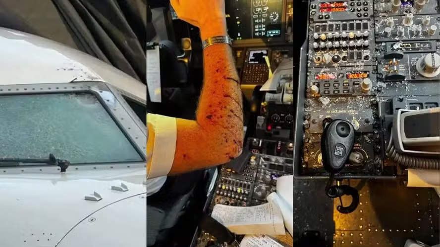 A passageira Heather Ramsey descreveu momentos de tensão a bordo. “Uma comissária levantou a voz e mandou interromper o serviço. Pouco depois, o piloto anunciou que havíamos colidido com um objeto”, relatou. Ela classificou a experiência como “assustadora”, observando que a aeronave desceu rapidamente cerca de 3 mil metros antes do pouso seguro. Imagens mostram o para-brisa danificado e ferimentos no braço do comandante.