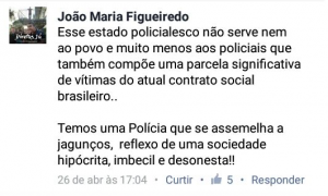 Na postagem do Facebook, Figueiredo escreveu: “Esse estado policialesco não serve nem ao povo e muito menos aos policiais que também compõe uma parcela significativa de vítimas do atual contrato social brasileiro. Temos uma polícia que se assemelha a jagunços, reflexo de uma sociedade hipócrita, imbecil e desonesta.”