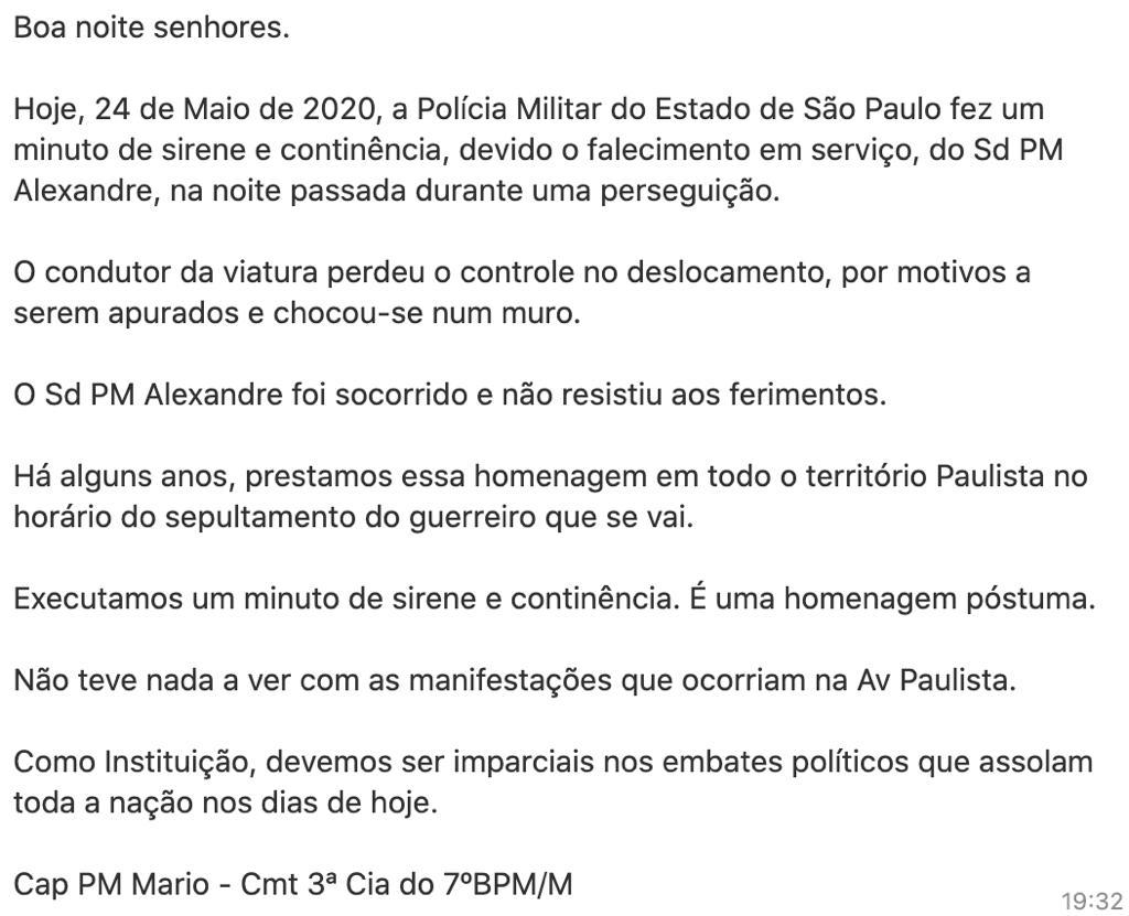 A Polícia Militar publicou nota esclarecendo que a instituição fez “um minuto de silêncio e continência” ao soldado Alexandre que faleceu em serviço na noite passada durante perseguição. Tratou-se, portanto, de uma homenagem póstuma sem relação com os protestos.