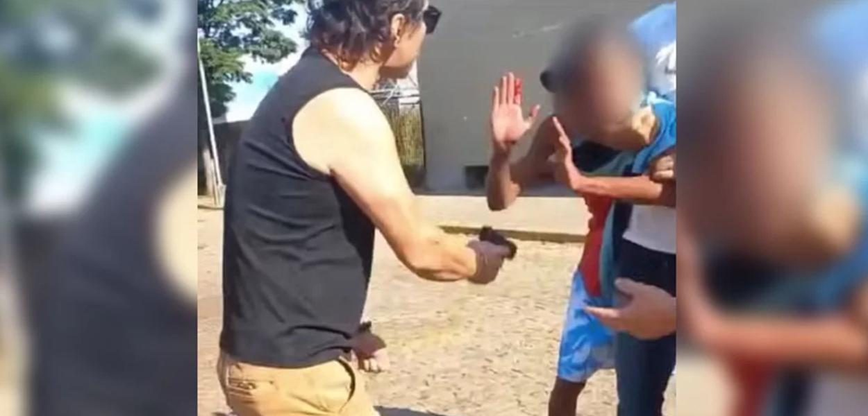 Um homem armado ameaça um jovem negro ao lado de uma policial.