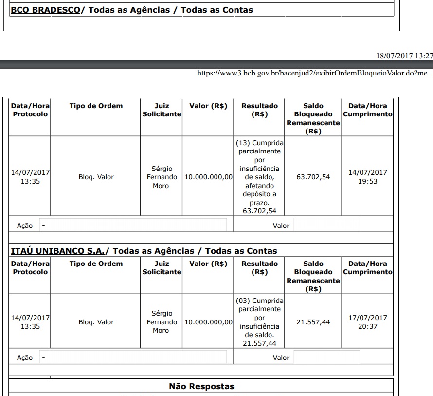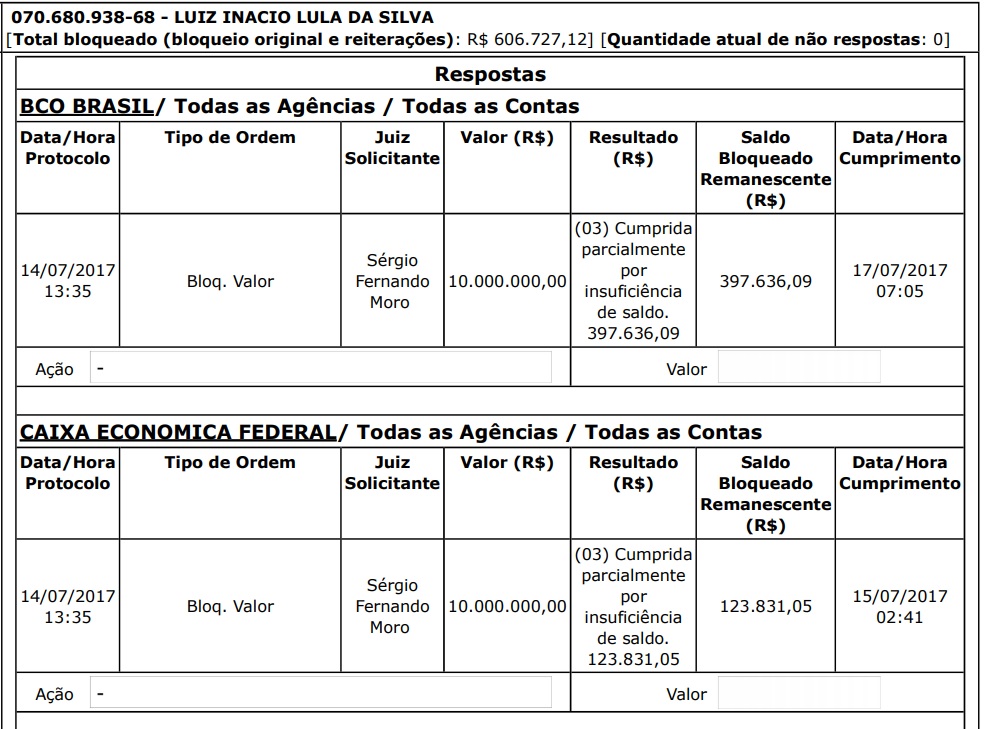 O ex-presidente Lula teve R$ 606.727,12 bloqueados pelo Banco Central nesta terça-feira, 18, por ordem do juiz federal Sérgio Moro na Operação Lava Jato. O confisco dos ativos do petista foi decretado a pedido do Ministério Público Federal. O dinheiro foi encontrado em quatro contas de Lula: R$ 397.636,09 (Banco do Brasil), R$ 123.831,05 (Caixa Econômica Federal), R$ 63.702,54 (Bradesco) e R$ 21.557,44 (Itaú).