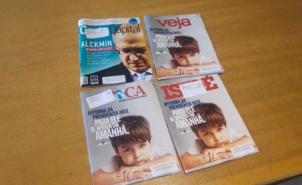 A última edição de três das quatro principais revistas semanais brasileiras, Veja, Época e IstoÉ, exibem uma interessante coincidência nas capas, tomadas por uma propaganda do governo federal em defesa da reforma da Previdência. A econômica Istoé Dinheiro também foi às bancas com a capa publicitária.