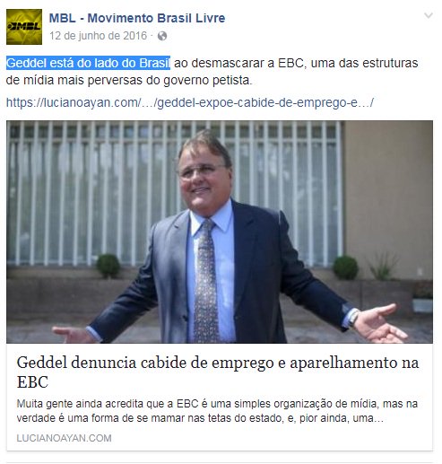 Post do MBL dizendo que “Geddel está do lado do Brasil” viraliza