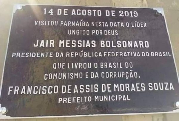 Em época de eleição, Mão Santa encomendou a placa, que conta com um texto: Visitou Parnaíba nesta data o líder ungido por Deus Jair Messias Bolsonaro Presidente da República federativa do Brasil que livrou o Brasil do comunismo e da corrupção.