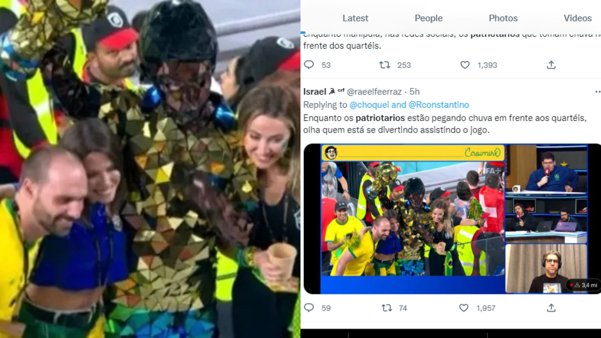“Enquanto os patriotarios estão pegando chuva em frente aos quartéis, olha quem está se divertindo assistindo o jogo”, disse um usuário do Twitter.