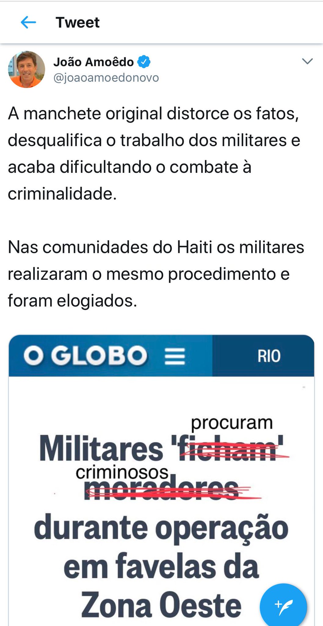 Amoêdo “corrigiu” o título de uma matéria de jornal. Para ele, quem está sendo fotografado são “criminosos”, não “moradores” — como o próprio Exército diz. Para Amoêdo, é a mesma coisa.