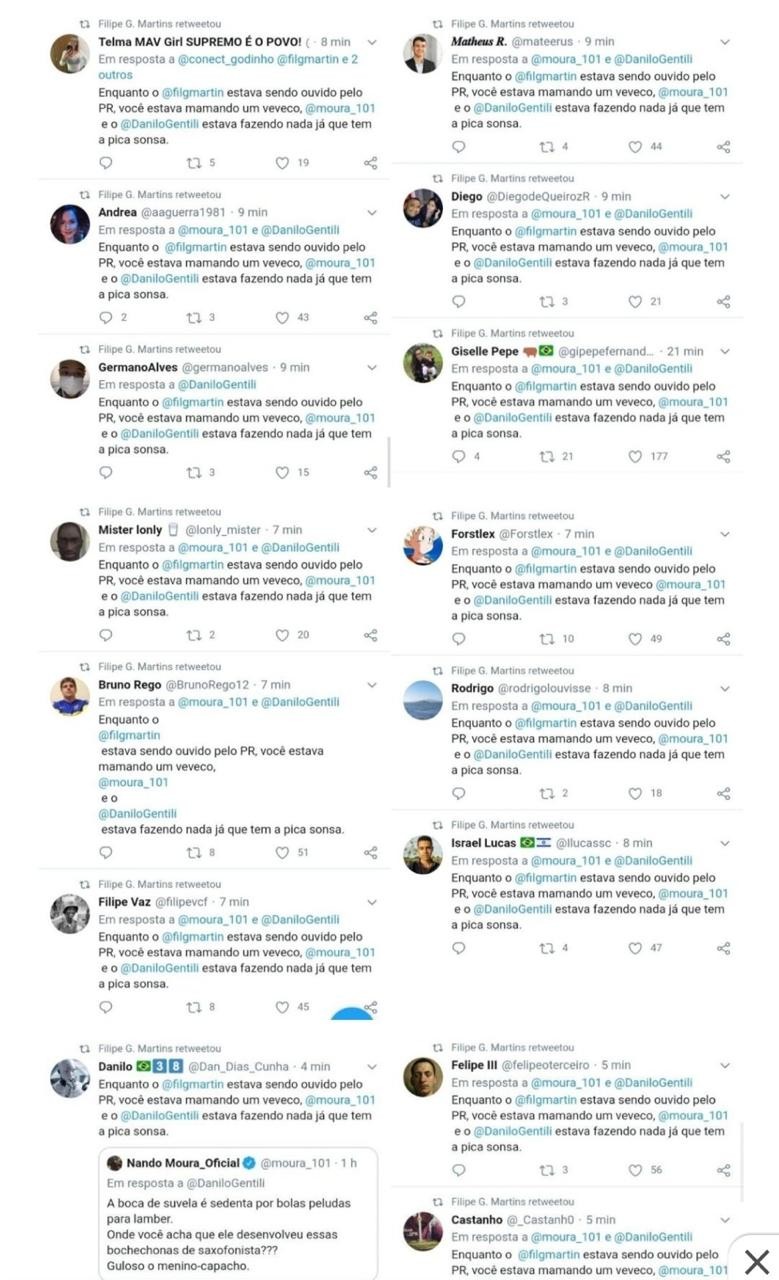 Eis que alguns minutos depois, os dois ex-apoiadores de Bolsonaro flagram uma série de mensagens que continham exatamente o mesmo texto, contra ambos. Elas foram apagadas logo após, mas eles haviam printado o flagrante uso de robôs, que logo exibiriam nas redes