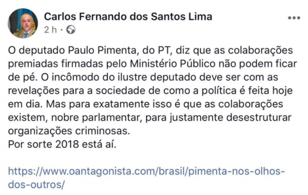 O procurador da Lava Jato Carlos Fernando dos Santos Lima atacou o deputado Paulo Pimenta, do PT, em postagem no Facebook.