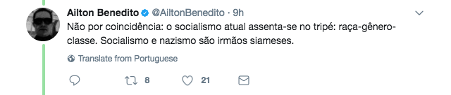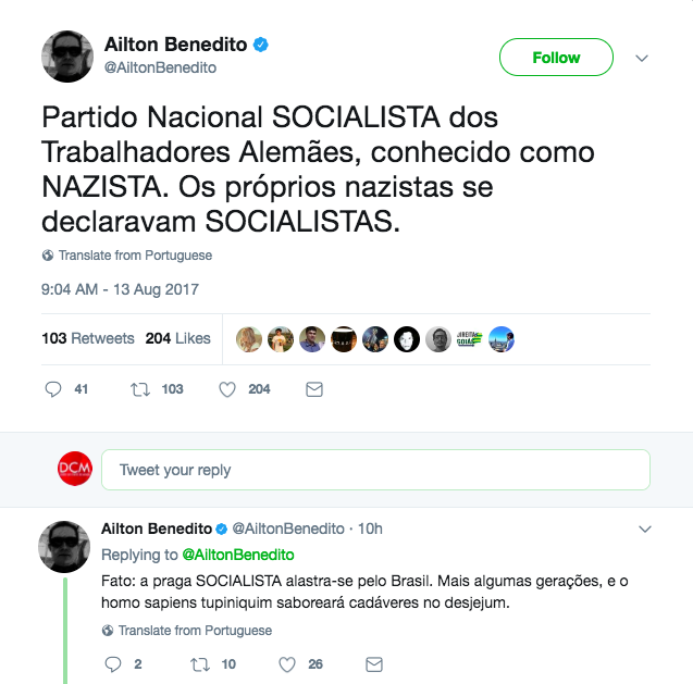 “Partido Nacional SOCIALISTA dos Trabalhadores Alemães, conhecido como NAZISTA. Os próprios nazistas se declaravam SOCIALISTAS”, escreveu.