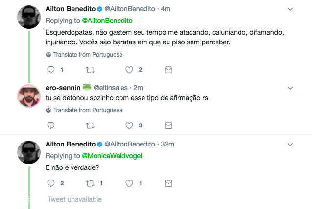 Ridicularizado, passou a ameaçar os detratores: “Esquerdopatas, não gastem seu tempo me atacando, caluniando, difamando, injuriando. Vocês são baratas em que eu piso sem perceber”.