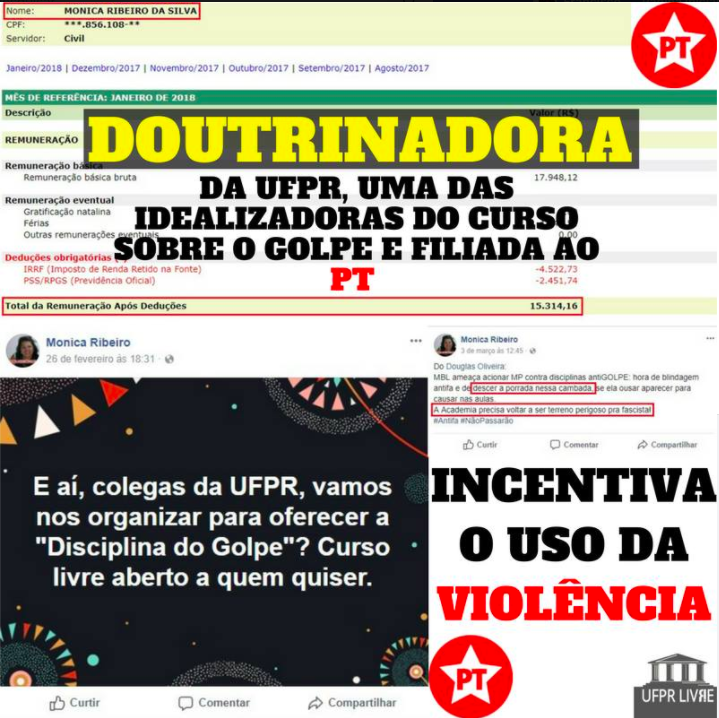 Não sou nem nunca fui filiada a qualquer partido político. Defendo a Universidade pública, gratuita e plural, como reza a Constituição Federal. O Ministro da Educação ofendeu a autonomia universitária, preceito assegurado nessa Constituição. Em defesa dessa autonomia, somam 28 Universidades pelo país a ofertar cursos e disciplinas que analisam o contexto político brasileiro do pós 2016. Na UFPR são 24 docentes, pesquisadores e pesquisadoras, professores e professoras, como eu. Mas, como é típico dos covardes, é fácil tentar caluniar e difamar quem pensa diferente. Lamentável.