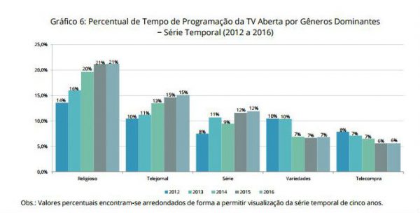 Um estudo da Ancine (Agência Nacional de Cinema), divulgado esta semana, constata o domínio da programação de cunho religioso na grade das principais emissoras de TV aberta no Brasil.