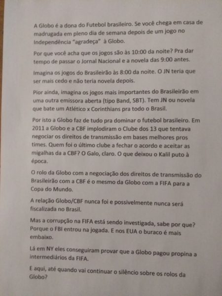 Além de estenderem a faixa com a lembrança de que a Globo pagou propina à Fifa, torcedores do Atlético Mineiro distribuíram um panfleto em que atribuem à emissora a responsabilidade exclusiva pelos jogos que vão até de madrugada, em dias de semana. “Por que vocês acham que os jogos são às 10:00 da noite? Para dar tempo de passar o Jornal Nacional e a novela das 9”, destaca. O texto lembra também que a Globo implodiu o Clube dos 13, para impedir qualquer obstáculo a seus projetos no futebol. É o mesmo rolo da Fifa. Para a emissora, é mais fácil pagar propina a negociar com uma entidade representativa dos clubes. “E aqui, até quando vai continuar o silêncio sobre os rolos da Globo?”