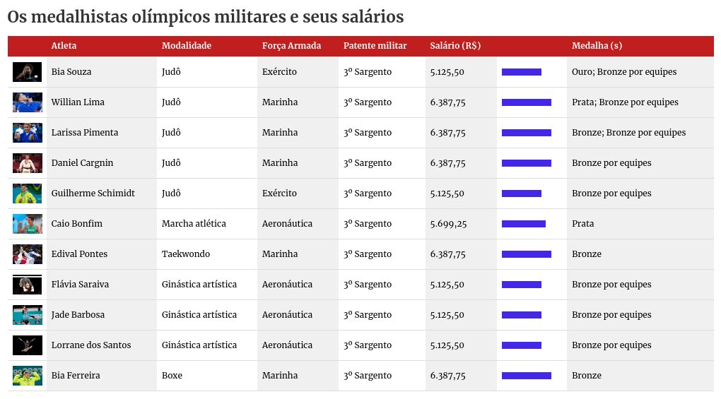 Entre os que recebem o menor valor estão a campeã olímpica do Judô, Bia Souza, e as ginastas Flávia Saraiva, Jade Barbosa e Lorrane dos Santos. Já os que recebem o maior valor são todos vinculados à Marinha, como Willian Lima e Larissa Pimenta, que conquistaram medalhas no Judô.