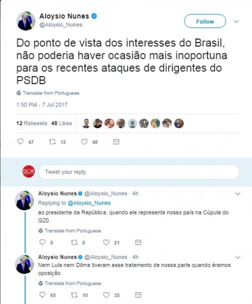 Do ministro Aloysio Nunes Ferreira no Twitter, sobre as declarações de Tasso Jereissati, presidente do partido, que preparam os tucanos para desembarcar de Temer e embarcar em Rodrigo Maia: