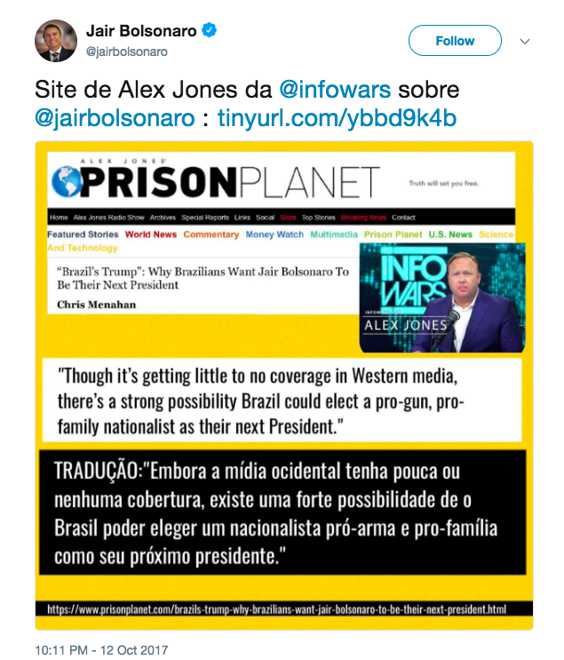 Uma “reportagem” em um de seus sites tinha o título “O Trump do Brasil: Por que os brasileiros querem que Bolsonaro seja seu próximo presidente”.