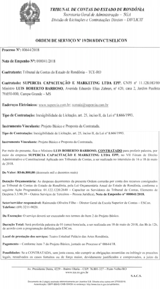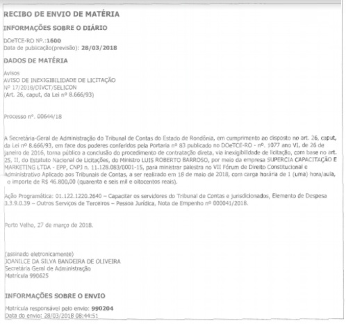 O doutor foi, sim, contratado por um órgão público de Rondônia, que deve estar nadando em dinheiro, para conferir uma palestra sobre direito constitucional do VIII Fórum de Direito Constitucional e Administrativo Aplicado aos Tribunas de Contas”.