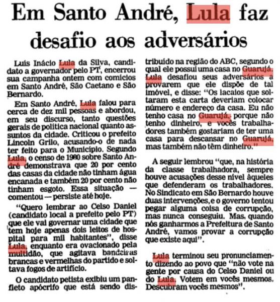 O recorte de jornal acima é da campanha de 1982, a primeira realizada pelo PT. Já naquela época, Lula enfrentava as mesmas acusações que lhe fazem hoje. Segundo os difamadores, tinha casa no Guarujá. Nesta reportagem, é relatado que ele desafiou os acusadores a apontarem o imóvel no litoral. “Na história da classe trabalhadora, sempre houve acusações desse nível àqueles que defenderam os trabalhadores. No Sindicato em São Bernardo, houve duas intervenções, e o governo tentou pegar alguma coisa de corrupção, mas nunca conseguiu”, disse.