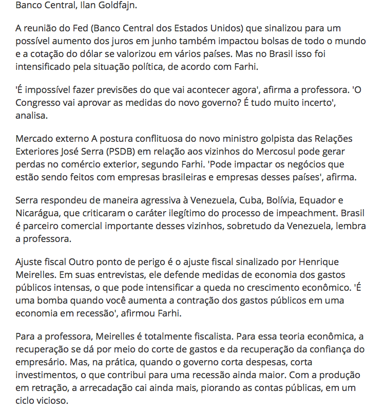 Um trecho mencionava que “a repercussão negativa ocorre na semana em que o ministro golpista Henrique Meirelles anunciou a nova equipe econômica, inclusive o novo presidente do Banco Central, Ilan Goldfajn.”.