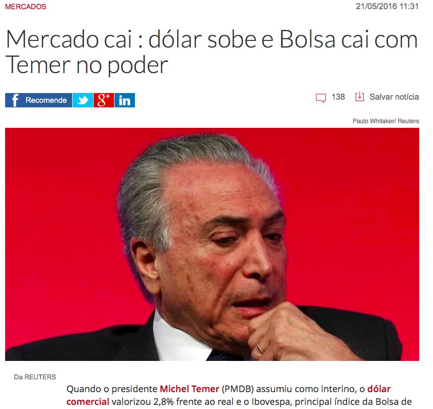 A revista Exame publicou, no dia 21, uma matéria falando sobre a reação frustrante, para quem esperava coisa diferente, do mercado ao impeachment.