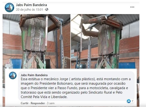 Segundo o post, a estátua está sendo montada por um artista plástico local chamado Jorge.