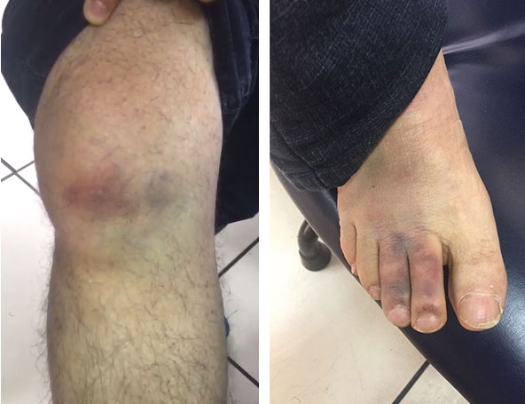 O bilhete acima, entregue por um detento no presídio de Benfica, pode ser esclarecedor sobre os mistérios que cercam a agressão sofrida por Garotinho. Sem nenhuma explicação Garotinho foi transferido da galeria A, na unidade de Benfica, onde estavam outras 40 pessoas, para a galeria B, que nem sequer estava em funcionamento, teve que ser lavada às pressas, e um colchão foi colocado em um beliche onde não havia uma pessoa sequer além dele. Na noite do mesmo dia, um homem de cabelos claros, olhos castanhos, aparentando 35 anos, tendo aproximadamente mais de 1,70m, por volta 1h30, entrou na galeria e em seguida na cela, e disse ao ex-governador: “Desce daí” (ele estava na parte de cima do beliche). Em seguida o homem vestindo blusa azul clara, calça jeans e sapato preto disse: “Você gosta muito de falar, né?”, e em seguida desferiu uma violenta paulada na rótula da perna direita, logo abaixo do joelho, conforme podem ver na foto abaixo. Logo depois vendo que Garotinho havia se curvado diante da intensa dor, o homem meteu a mão na cintura e puxou uma pistola prateada que encostou próximo ao rosto dele e disse: “Você não vai morrer hoje para não sujar para pessoal aqui do lado”, apontando na direção da galeria C, onde estão os presos da Lava Jato, incluindo Sérgio Cabral, que foram denunciados por Garotinho. Em seguida o homem completou: “Mas vou deixar uma lembrancinha pra você”, e aproveitando que Garotinho estava descalço pisou com o salto do sapato esmagando os dedos do pé direito, cuja radiografia acusou fissura óssea entre o segundo e o terceiro dedo, causando um hematoma de grande proporções, como mostra a foto abaixo.
