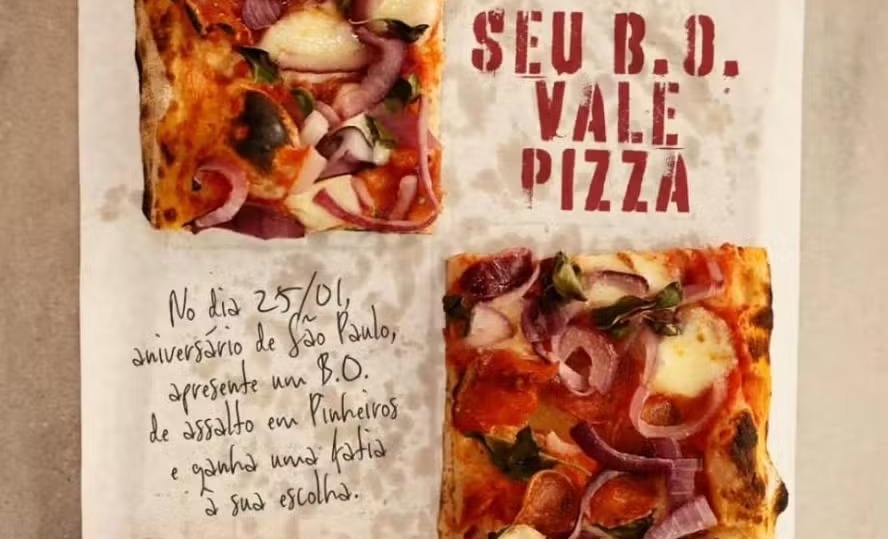 Uma pizzaria de Pinheiros, na zona oeste de São Paulo, chamou atenção ao anunciar que vai distribuir fatias gratuitas a pessoas que apresentarem boletim de ocorrência por assalto ocorrido no bairro. A ação será realizada neste domingo (25), data do aniversário da capital, e foi divulgada nas redes sociais como forma de protesto contra a escalada da violência na região.