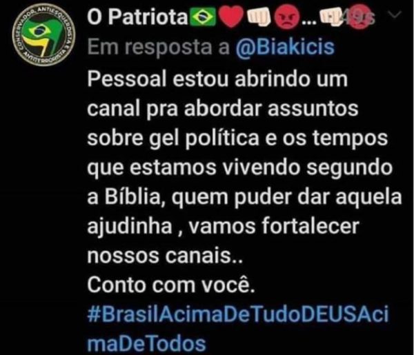 O site bolsonarista ‘O patriota’ pediu em seu Twitter uma ajuda dos internautas pois estará abrindo um canal para abordar assuntos sobre ‘gel política’ e ‘os tempos que estamos vivendo segundo a Bíblia’.