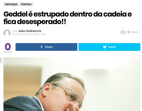O mesmo jornal agora diz que Geddel é estrupado (sic) na cadeia e fica desesperado. O Brasil é uma coisa linda.
