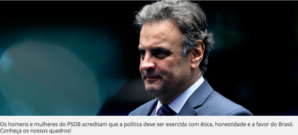 No site oficial do PSDB, uma foto do Mineirinho da Odebrecht ilustra a seguinte legenda: “Os homens e mulheres do PSDB acreditam que a política deve ser exercida com ética, honestidade e a favor do Brasil.”