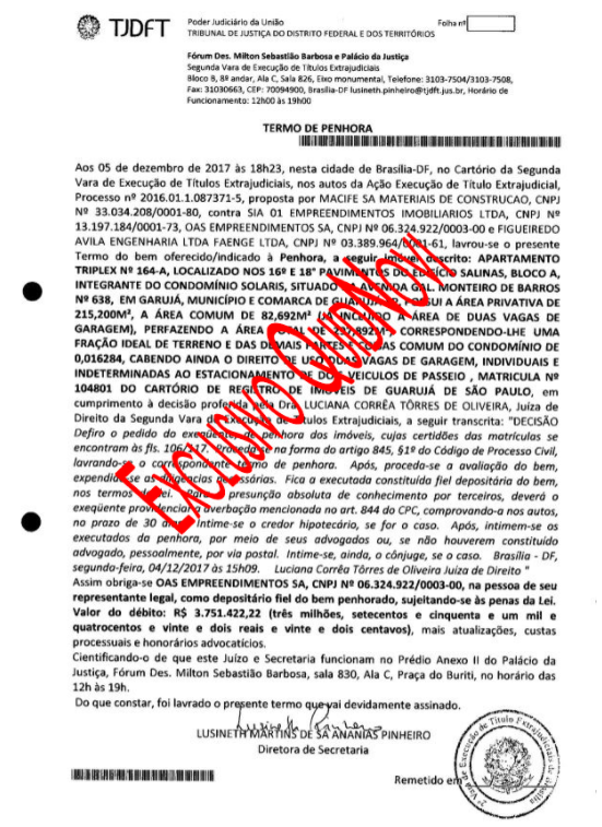 Site publica alvará de penhora de triplex para ‘satisfação de dívida’ da OAS expedido pelo TJDFT