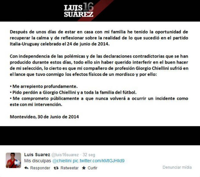 Suárez começa o texto dizendo que o tempo o ajudou a refletir sobre o que havia feito, e que isso o teria motivado a publicar a nota. Vítima da agressão do uruguaio, Chiellini já havia dito que o perdoava e se queixou, inclusive, da severidade da punição. O atacante garantiu, ainda, que o “incidente” não voltará a acontecer – ele já havia mordido adversários duas vezes, quando jogava pelo Ajax e pelo atual clube, o Liverpool.