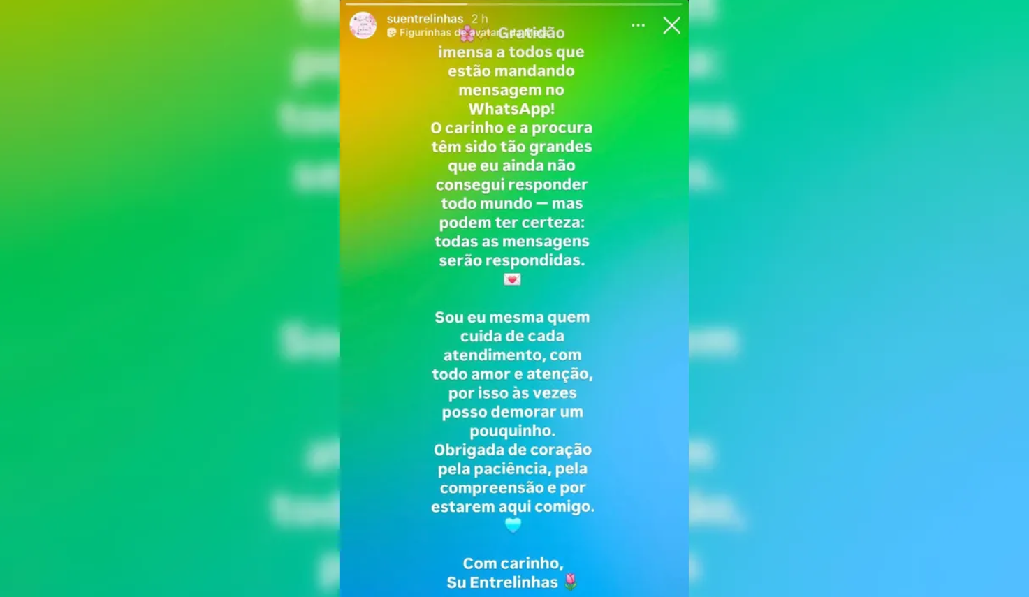 A ex-detenta administra a marca ‘Su Entrelinhas’, criada em Angatuba, interior de São Paulo, especializada na produção de chinelos customizados com pedrarias e brilhos. Nos Stories, ela agradeceu o aumento das encomendas e afirmou que ainda tenta responder todas as mensagens recebidas.