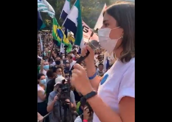 Ela discursou com a camiseta do movimento Acredito no carro de som neste domingo (12).