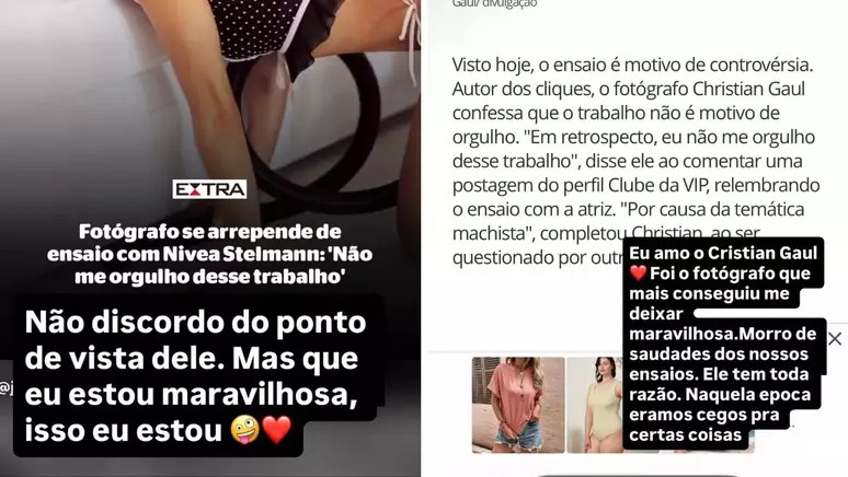 A atriz Nívea Stelmann comentou o ensaio sensual que fez para a revista VIP em 2006, que voltou a repercutir nas redes sociais após críticas do fotógrafo responsável pelas imagens, Christian Gaul. Ele afirmou ter se arrependido do trabalho, classificando-o como de “temática machista”.