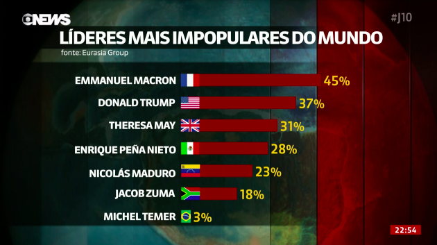 O brasileiro Michel Temer é considerado o presidente com maior taxa de rejeição do mundo, atrás até do venezuelano Nicolás Maduro, indicou uma pesquisa do grupo de análise política Eurasia. De acordo com a sondagem, que coletou dados a partir do mês de agosto, Temer detém 3% de aprovação popular, a menor em todo o mundo.