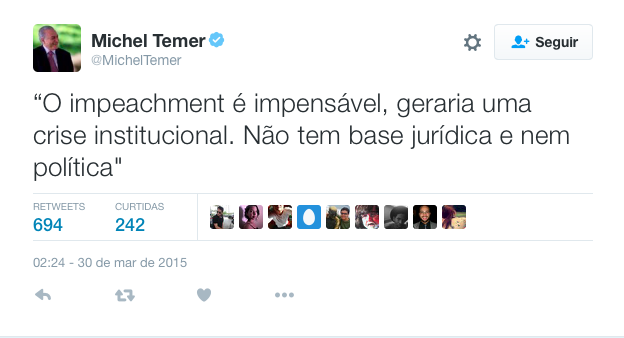 Temer, há menos de um ano: “Impeachment geraria crise institucional. Não tem base jurídica e nem política”