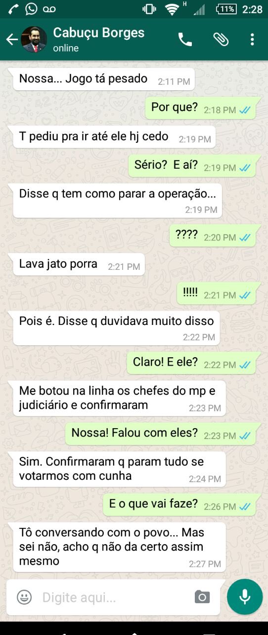 O deputado Cabuçu Borges, do PMDB do Amapá, teve esta troca de mensagens de WhatsApp vazada. Ele não negou a autenticidade.