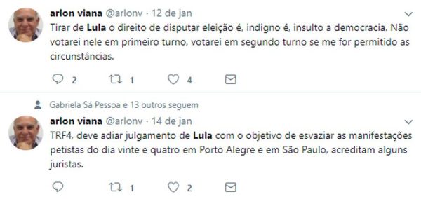 Filiado ao MDB há 40 anos, Viana também já defendeu Lula nas redes sociais. “Tirar de Lula o direito de disputar eleição é indigno e insulto à democracia. Não votarei nele em 1.° turno, votarei em 2.° turno, se me forem permitidas as circunstâncias.”
