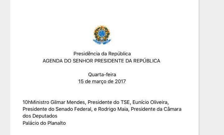 No dia seguinte à divulgação da segunda lista de Janot, Temer tinha encontro marcado na agenda com Gilmar Mendes, seu conselheiro e melhor amigo nas horas incertas, e dois investigados: Rodrigo Maia, presidente da Câmara, e Eunício Oliveira, presidente do Senado.