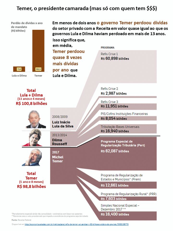 Temer vai perdoar R$ 62 bilhões em dívidas, o dobro do previsto, o mesmo que os governos Lula e Dilma em 13 anos
