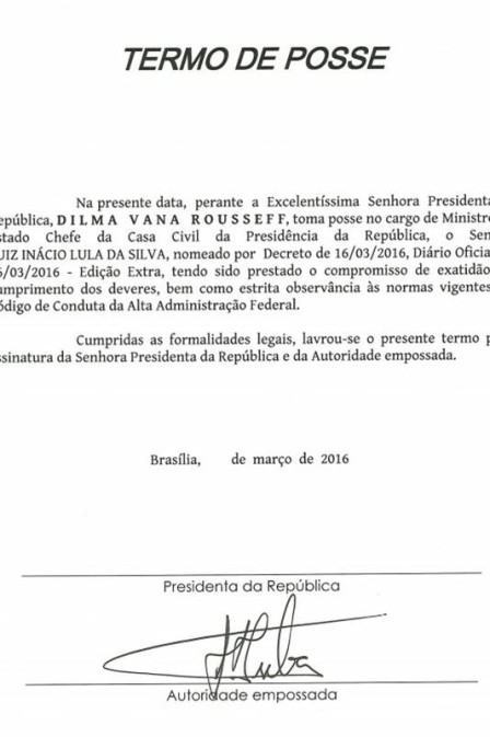 Termo de posse enviado a Lula não tinha assinatura de Dilma e não poderia ser usado como proteção judicial