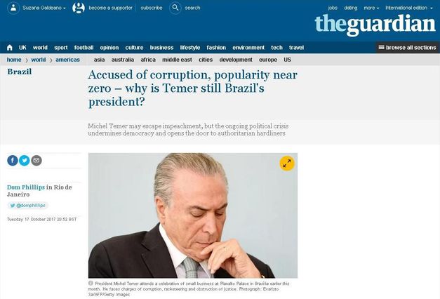 Se o recente declínio do Brasil pudesse ser mensurado pela queda da popularidade de seus presidentes, Michel Temer representaria o fundo do poço. Assim começa a matéria publicada nesta quarta-feira (18) pelo jornal britânico The Guardian.